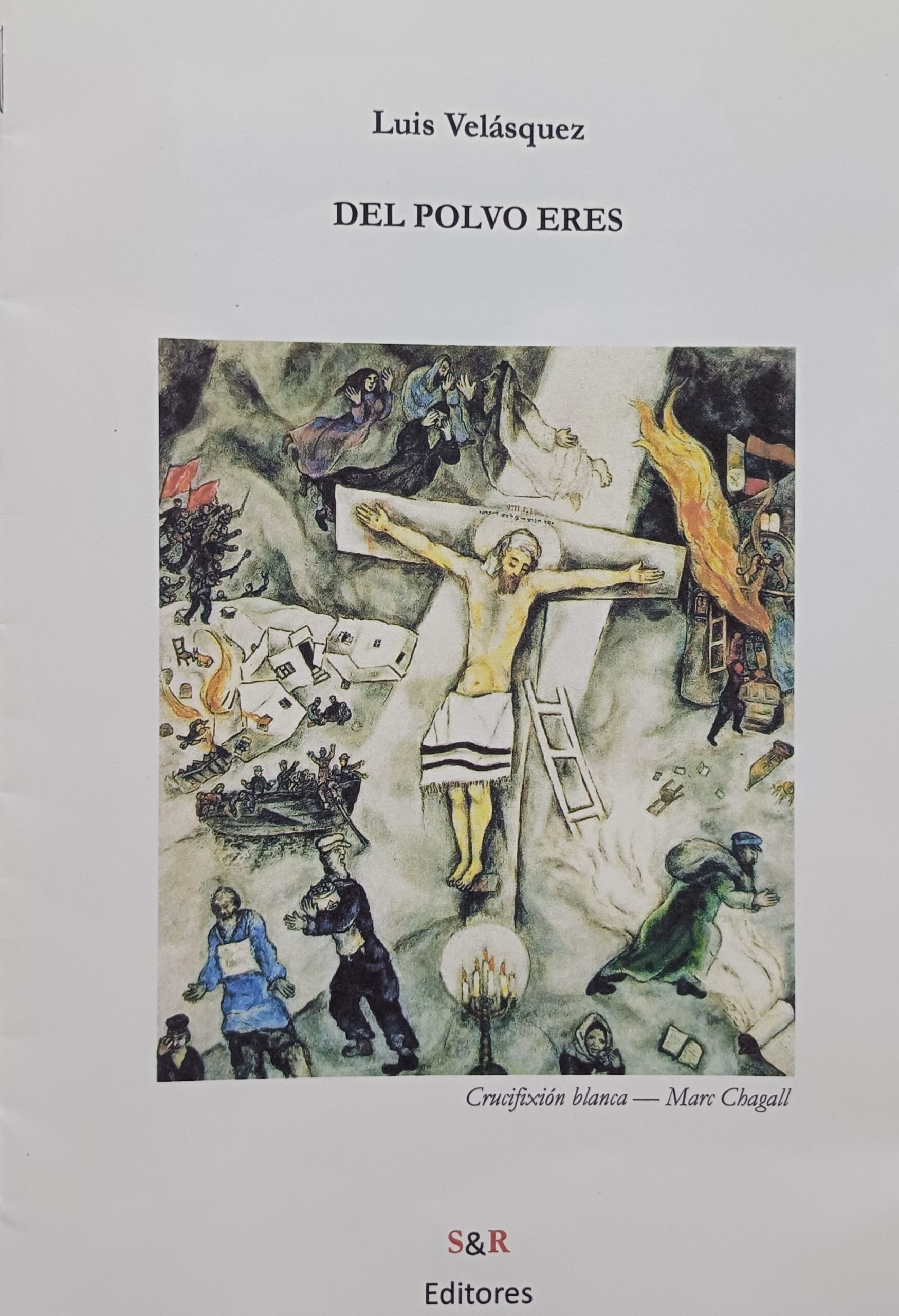 La edición, encantadoramente sencilla y cuidada, nos presenta en la portada un cuadro del gran artista Marc Chagall, nacido en el antiguo Imperio Ruso en 1887, y muerto en Francia en 1985. El tema del cuadro es la crucifixión, en ese estilo, tan particularmente mágico, surrealista, del maravilloso pintor de amantes y vacas voladoras. Y no podía ser mejor, para ambientar la poesía de Luis. Una poesía marcada por la tensión sobre Dios, los hombres, la vida, y el misterio de la muerte.